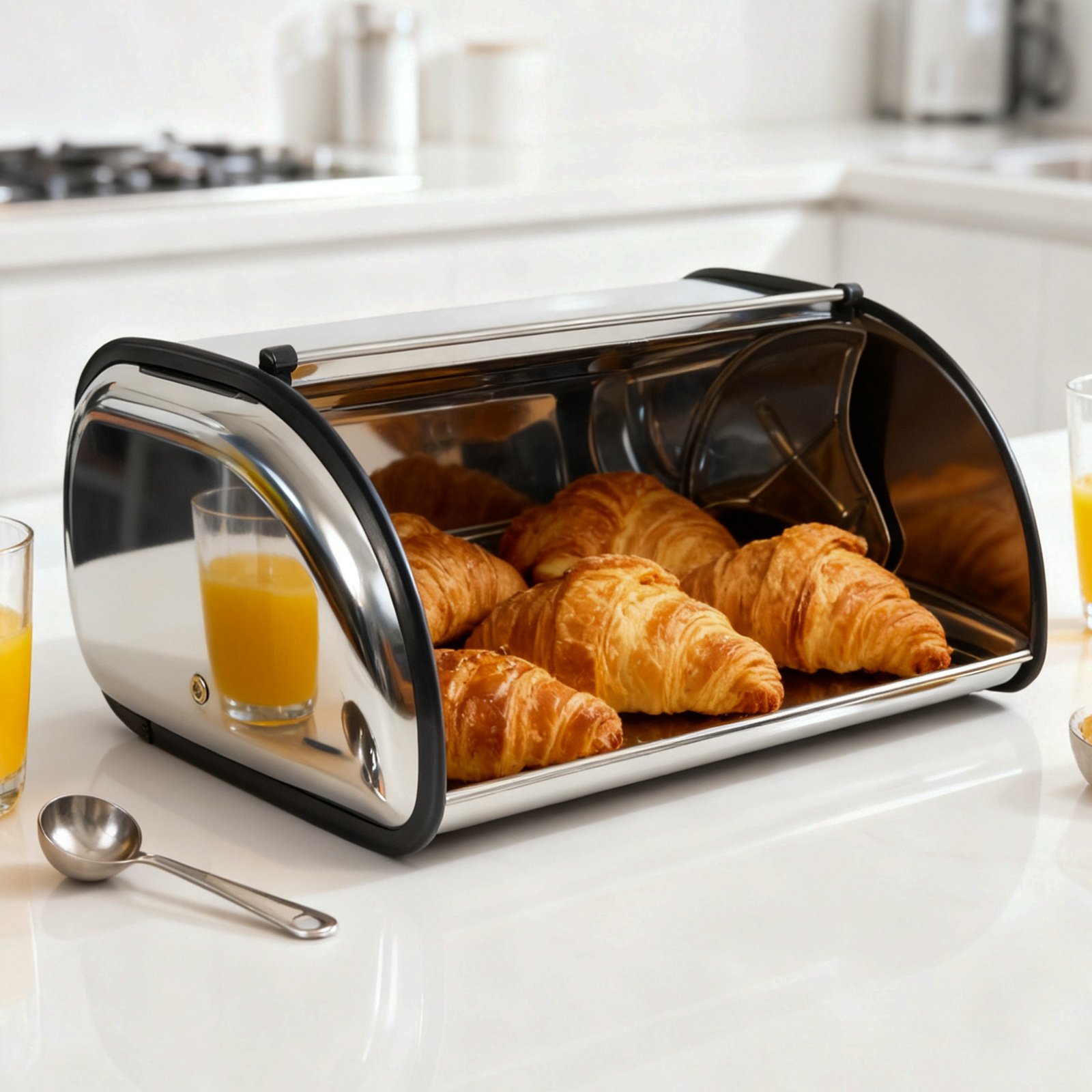 Panera metálica con tapa deslizante, ideal para mantener el pan fresco y ordenado en la cocina. Diseño práctico y resistente.
